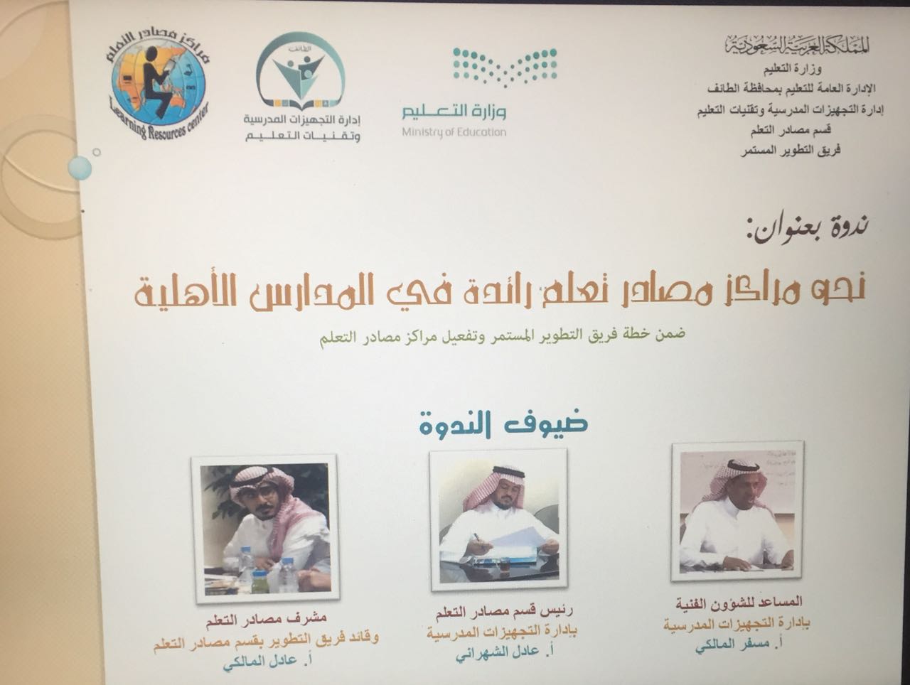 ট ইট র إدارة تعليم الطائف قسم مصادر التعلم بإدارة التجهيزات المدرسية وتقنيات التعليم ينظم ندوة بعنوان نحو مراكز مصادر تعلم رائدة في المدارس الأهلية بمجمع الأندلس التعليمي الأهلي وذلك بمتابعة من مدير إدارة