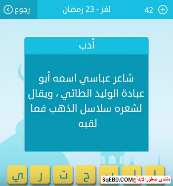 جواب سؤال شاعر عباسي اسمه أبو عبادة الطائي ويقال لسعرة سلاسل الذهب فما لقبه 23 رمضان من لعبة رشفة صقور الإبدآع