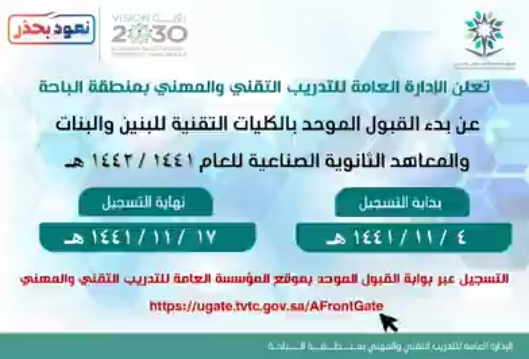 ট ইট র ـڸے ا ڸـ ـ ٱ ڝم ې G20 التدريب التقني والمهني بمنطقة الباحة يعلن مواعيد القبول والتسجيل بنين وبنات من ١٤٤١ ١١ ٤ إلى ١٤٤١ ١١ ١٧ رابط القبول الموحد Https T Co Iucxxbypgg مزيد من المعلومات Https T Co