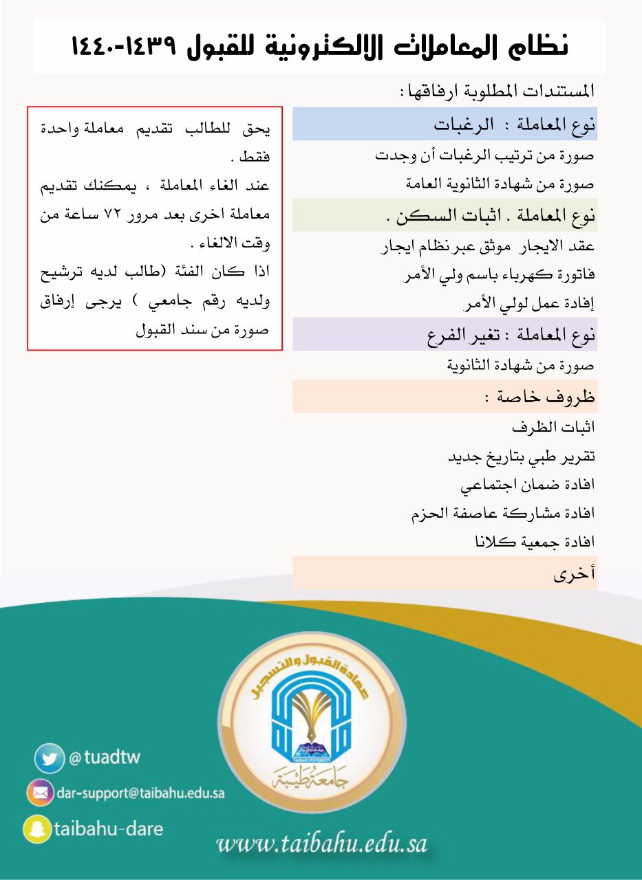 جامعة طيبة Taibah U على تويتر خبر يحق للطالب والطالبة تقديم معاملة واحدة فقط من خلال نظام المعاملات الإلكترونية الخاص بعمليات القبول الجامعي بـ جامعة طيبة وفي حال الغاء المعاملة من قبل صاحب