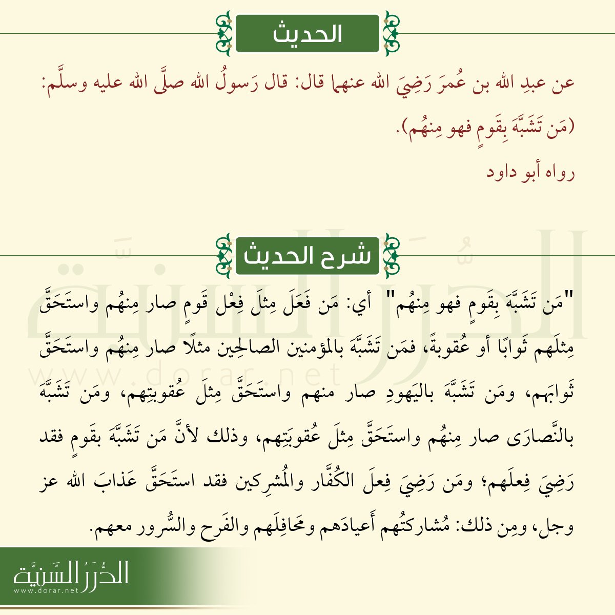 موقع الدرر الس ني ة Twitterren عن عبد الله بن ع مر ر ض ي الله عنهما قال قال ر سول الله صل ى الله عليه وسل م م ن ت ش ب ه ب ق وم فهو م نه م رواه ابو داود الولاء والبراء الكريسماس رأس السنة Https T Co F0ri4cqx6v