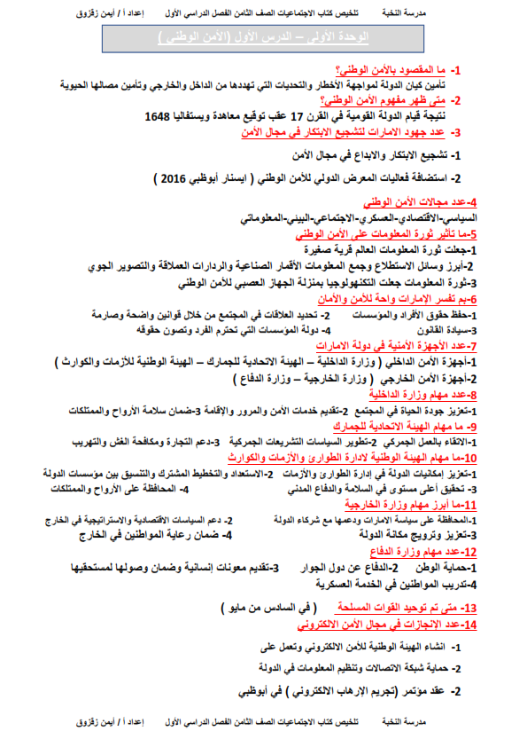 حل وتلخيص درس الامن الوطني في الاجتماعيات للصف الثامن الفصل الاول