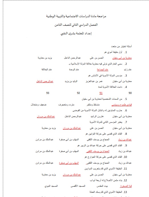 اوراق عمل شاملة في الدراسات الاجتماعية والتربية الوطنية للصف الثامن الفصل الثاني