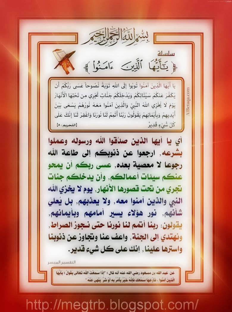يا أيها الذين آمنوا توبوا إلى الله توبة نصوحا عسى ربكم أن يكفر عنكم سيئاتكم سورة التحريم آية 8 Youtube